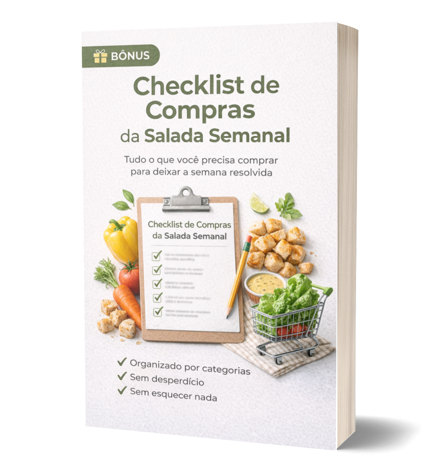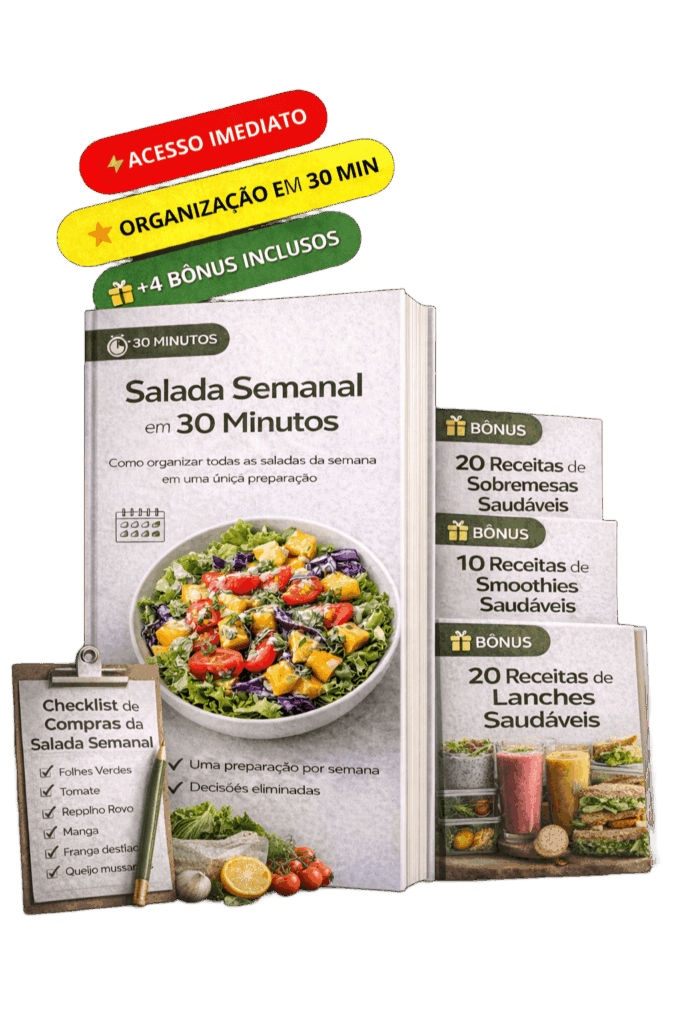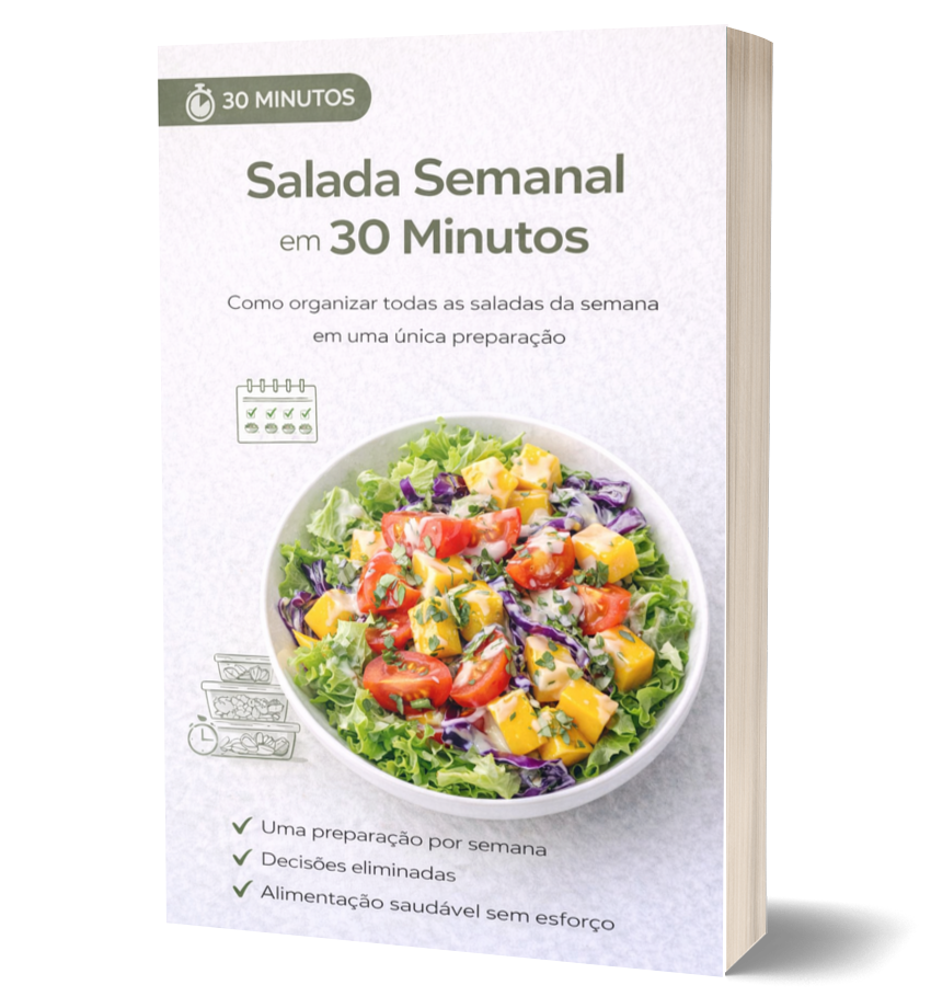 Você terá acesso a um método para fazer saladas deliciosas pra semana inteira em apenas 30 minutos, de maneira organizada e prática. Nosso método é pensado para quem quer poupar tempo e garantir refeições nutritivas e saborosas para a semana toda!