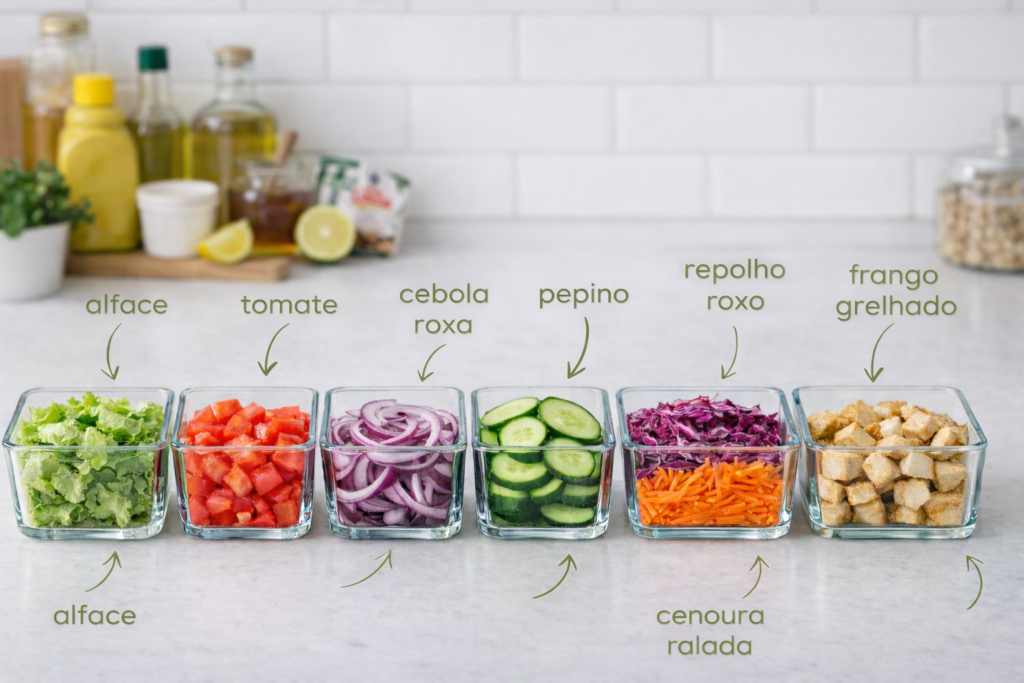 Um sistema simples para organizar suas saladas para a semana inteira em apenas 30 minutos no Domingo, e não falhar na alimentação mesmo em dias corridos ou quando estiver sem energia para decidir o que comer.